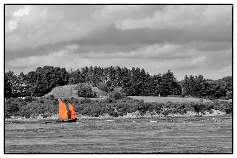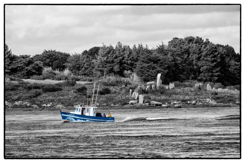 Devant le cairn de Gavrinis, dans le golfe du Morbihan